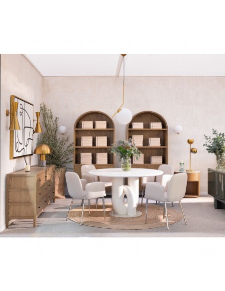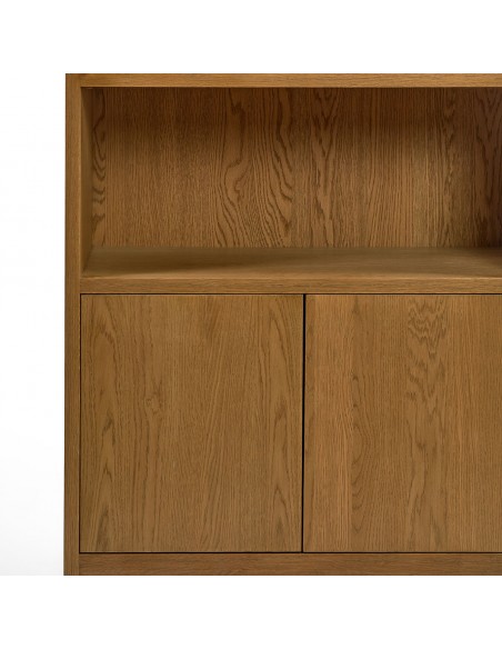 Vitrina acabada en roble natural con estantes de la misma madera y dos puertas en la parte baja. Cuenta con 3 baldas en la parte superior donde colocar tus objetos decorativos de forma visible y dos baldas dentro de las puertas para guardar todo aquello que no quieras que quede a la vista. Su original diseño acabado en forma redonda en la parte superior de la vitrina aportan armonía tu ambiente y a la pieza, de líneas sencillas y minimalistas será el toque de sofisticación que tu sala de estar, comedor u oficina necesitan. También disponible en color blanco grisáceo.